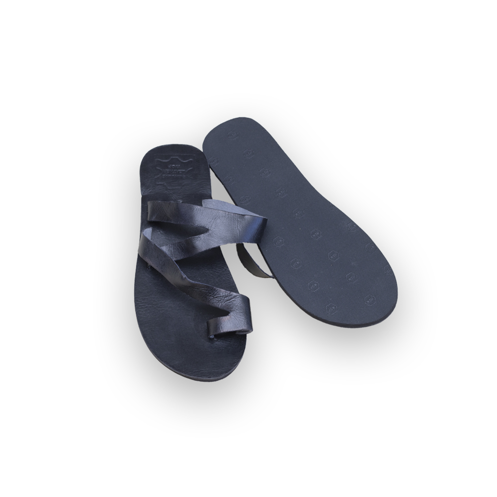 A handmade black sandal featuring a toe-post design, where the strap is inserted between the big toe and the second toe for a secure, comfortable fit. Custom-made and ready in one week.